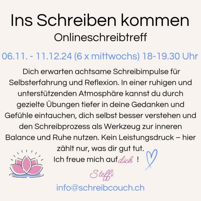 Hast du Lust, das Schreiben in einer inspirierenden und unterstützenden Umgebung auszuprobieren? Beim Onlinekurs „Ins Schreiben kommen“ laden wir uns gegenseitig ein, mit Worten zu spielen, Gedanken zu teilen und die Freude am Schreiben zu entdecken.